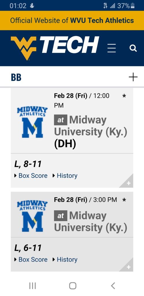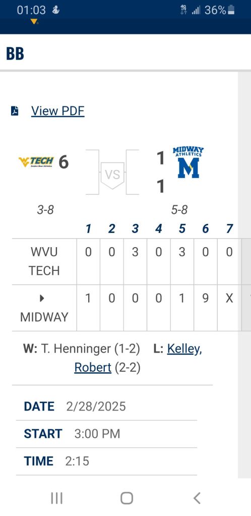 Golden Bears π» bats were working well but Midway rallies late to take both ends of league twin bill on Friday. Around the Valley in 60 Days West Virginia Tech University March 1, 2025 1 Minute The team will play a third and final game of the series Saturday in Midway, Kentucky. Share this: Click to share on Facebook (Opens in new window) Facebook Click to share on X (Opens in new window) X Like Loading... Related Published by Around the Valley in 60 Days Trying to find Positive in a World π that needs more of it! View all posts by Around the Valley in 60 Days Published March 1, 2025
