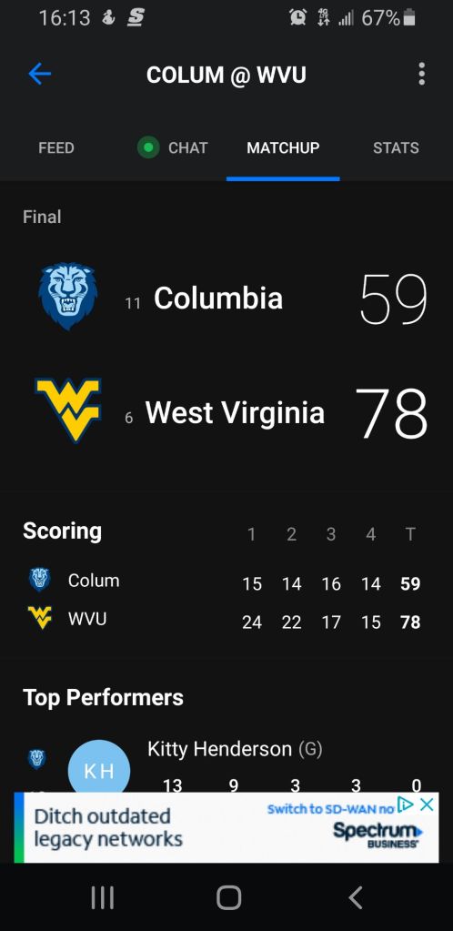 Columbia University and West Virginia University played the opener and the Ivy League Lions played the second half at 32-30. Two guards for WVU combined for over 50 points in leading the Mountaineers to victory.