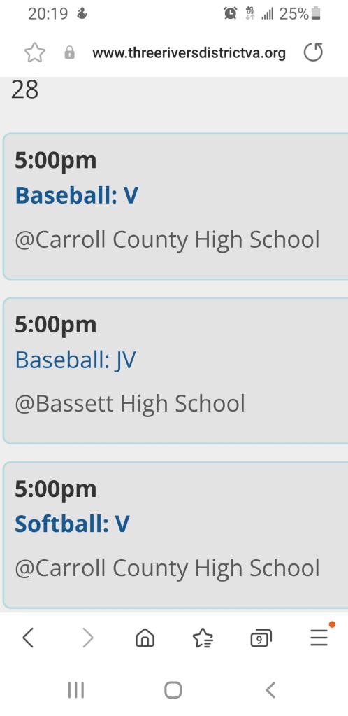 5:00 – (Bassett) – Adam Nester and his high flying Cavaliers will put their 3-0 mark on the line versus the Bassett Bengals in a JV Baseball βΎοΈ game. The Cavaliers have yet to surrender a run πββοΈ so far this season. The JV Softball team played their game a day early and picked up their second victory last night π.