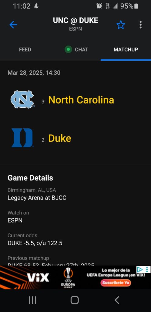 2:30 (ESPN) – Blue Devils and Tar Heels women down in Alabama for a spot in the Elite Eight. NC State plays LSU at 7:30pm with the same thing on the line. The fourth ACC Women’s team still dancing π plays at 1pm Saturday as Notre Dame faces TCU (each is a 2 versus 3)