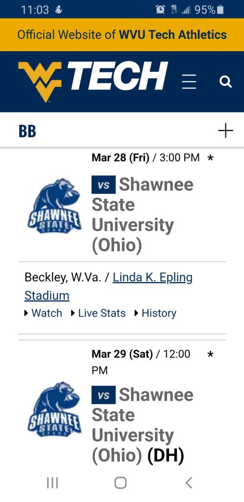 3:00 (Beckley, WV)- First Pitch in the opening game of a three game set for our Golden Bears π» versus Shawnee State. We will be up there to take care of the double header Saturday at Noon but they will be flying solo today.