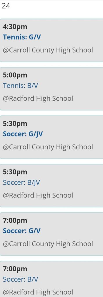 ” We were able to get the tennis match in. Only one match was shortened because of the rain. Our Varsity Girls played a tremendous match today against a very talented Radford team. We lost 9-0, but there were glimpses of more improvement from the team. Proud of their effort today.”