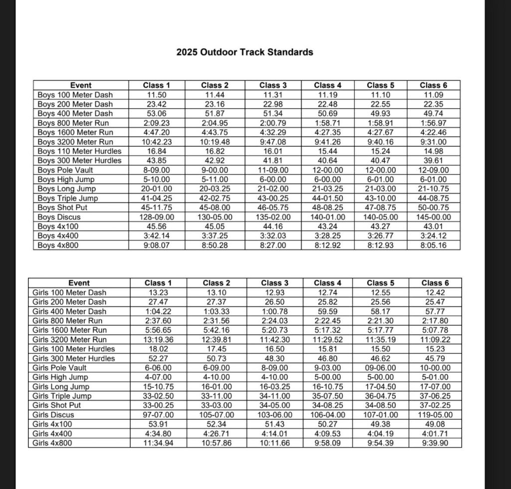 Coach Montgomery was gracious enough to take the time to walk me through the way an Athlete can qualify for the State Meet during the season. There is a pre-determined mark in each event that if a Boy π¦ or Girl π§ beats, said person can book a seat πΊ on the Bus.