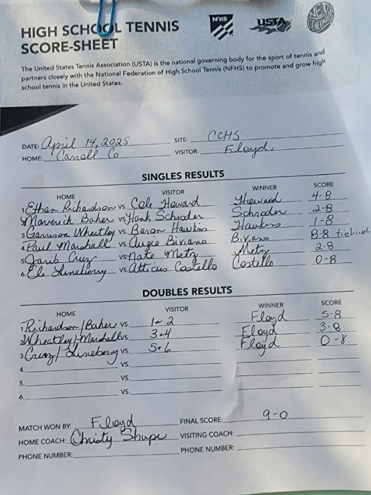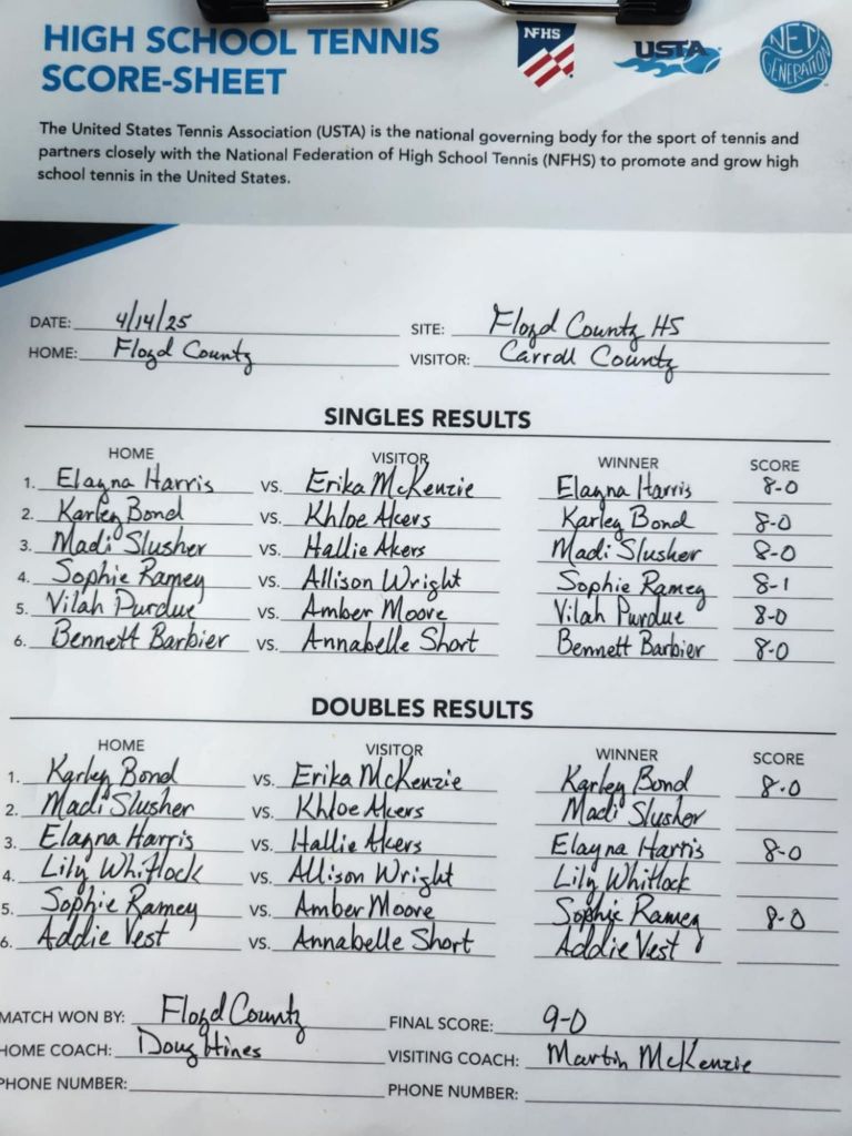 “This afternoon the Varsity Girls Tennis team faced a very talented and well coached Floyd County team. We lost 9-0, but showed improvement in a lot of areas. The main goal right now for us is the little improvements that the girls show me from week to week. One match at a time!”