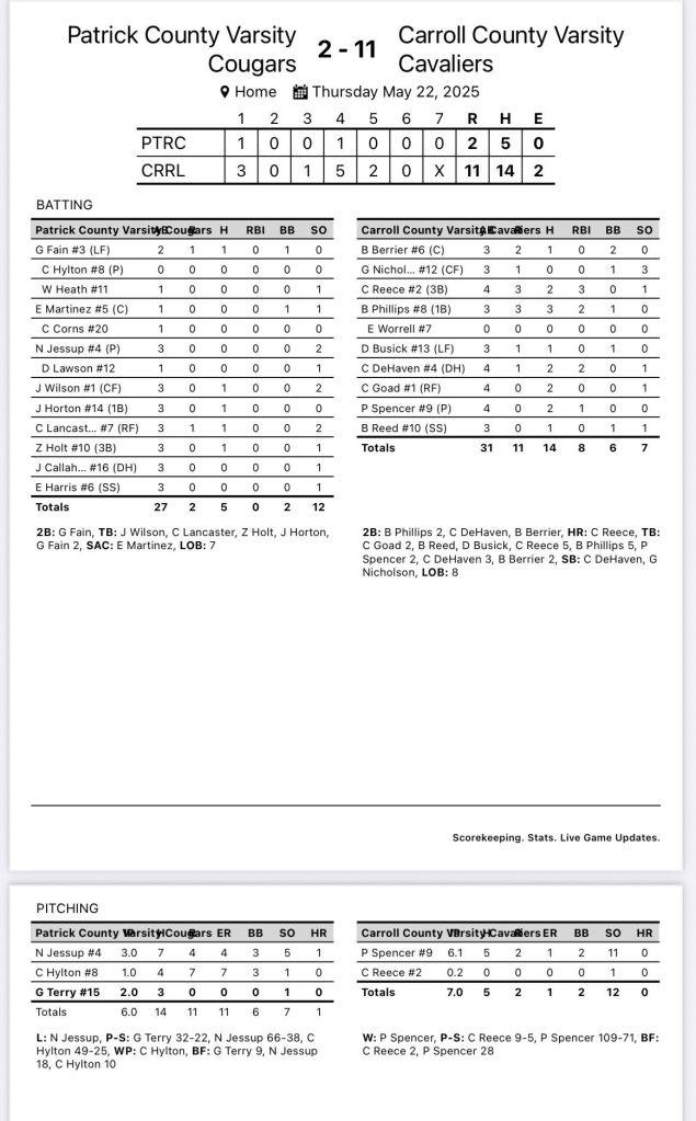 As dominant as Carroll County has been all season in the District, Patrick County entered the night just one game back. The Cougars played the Cavaliers to a one run game in Stuart so the entered the night with confidence.