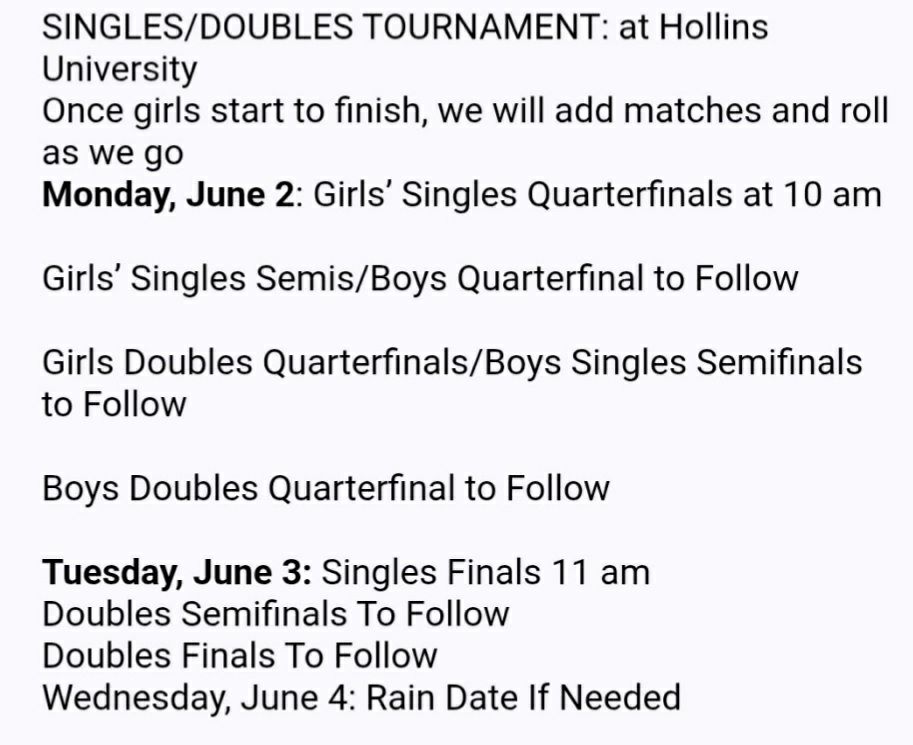 10:00 – Erika McKenzie will get things started for Carroll County High School as the recent Graduate π plays her QF Singles match.