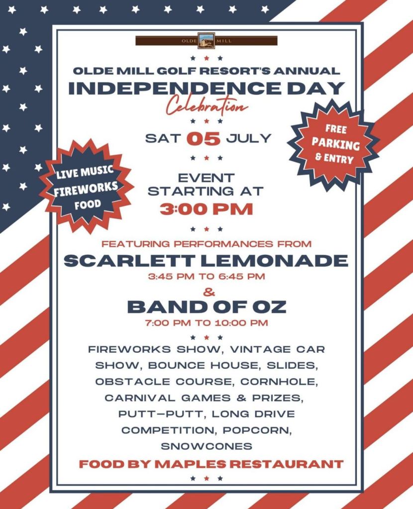 Olde Mill Golf β³ Resort is getting ready to Celebrate our Nation’s Birthday π and they would like you to join them ! Around the Valley in 60 Days Carroll County July 2, 2025 1 Minute Fun Day planned for out in our Village! Share this: Click to share on Facebook (Opens in new window) Facebook Click to share on X (Opens in new window) X Like Loading... Related Published by Around the Valley in 60 Days Trying to find Positive in a World π that needs more of it! View all posts by Around the Valley in 60 Days Published July 2, 2025