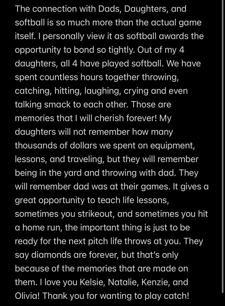 Diamonds π are a Girls Best Friend : My Partner, Kevin Burress checks in with his thoughts about Fathers and Daughters! Around the Valley in 60 Days Softball Book 2015 July 10, 2025 1 Minute Thank You Sir ! Share this: Click to share on Facebook (Opens in new window) Facebook Click to share on X (Opens in new window) X Like Loading... Related Published by Around the Valley in 60 Days Trying to find Positive in a World π that needs more of it! View all posts by Around the Valley in 60 Days Published July 10, 2025