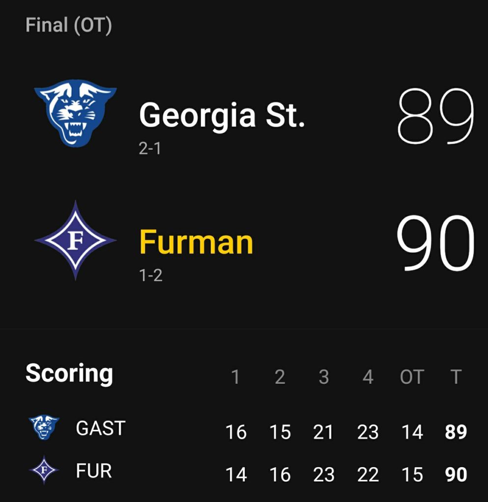 0:11.0 – Fouled again, popped the net for a fifth straight time before missing one. Furman led 90-87 and held on for a thrilling 90-89 victory on ESPN+..