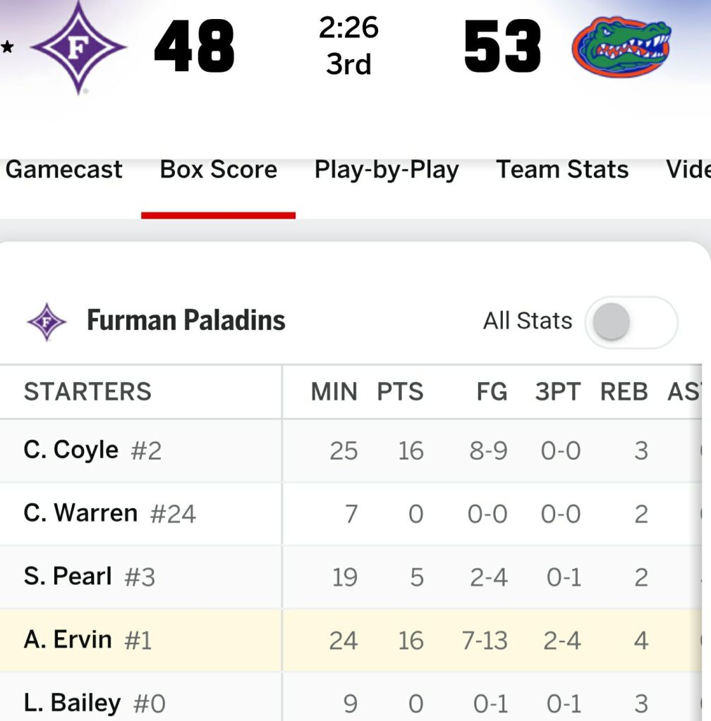 At the break, Furman University is sill within fighting πͺ distance at 40 – 35, surviving a big Gator run to start the second quarter.