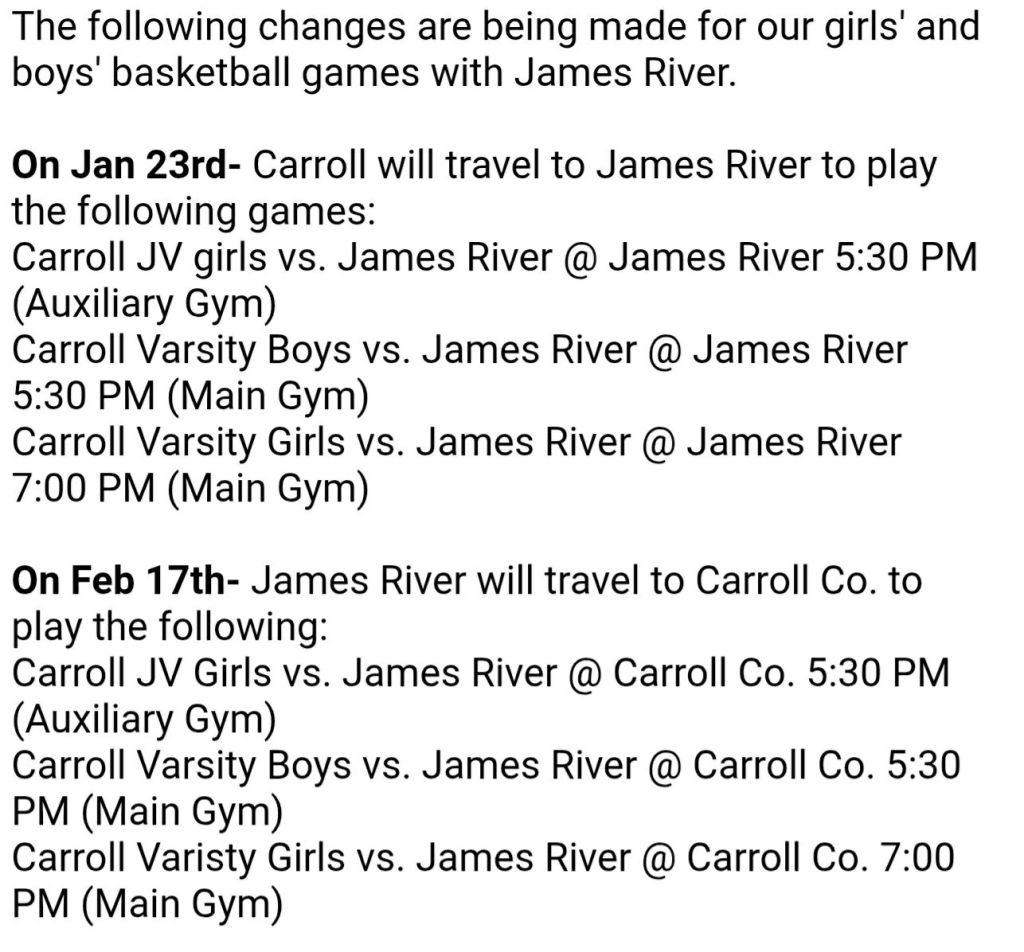 Mr DeHaven announces schedule changes for Basketball π versus James River High School Around the Valley in 60 Days Carroll County High School January 16, 2026 1 Minute The listing would make it appear that James River High School doesn’t have a Junior Varsity Boys team this year. Share this: Share on Facebook (Opens in new window) Facebook Share on X (Opens in new window) X Like Loading... Related Published by Around the Valley in 60 Days Trying to find Positive in a World π that needs more of it! View all posts by Around the Valley in 60 Days Published January 16, 2026