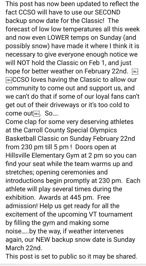 Vickey Ritchie has announced that we will once again be moving the Special Olympics Basketball Classic with the third date being Sunday, February 22nd. It has to be warmer by then, right ??