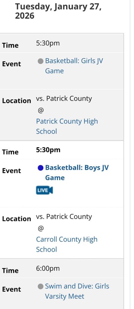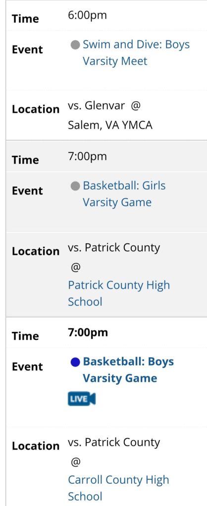 All basketball games vs Patrick Co and swim meet vs Glenvar are cancelled tomorrow.