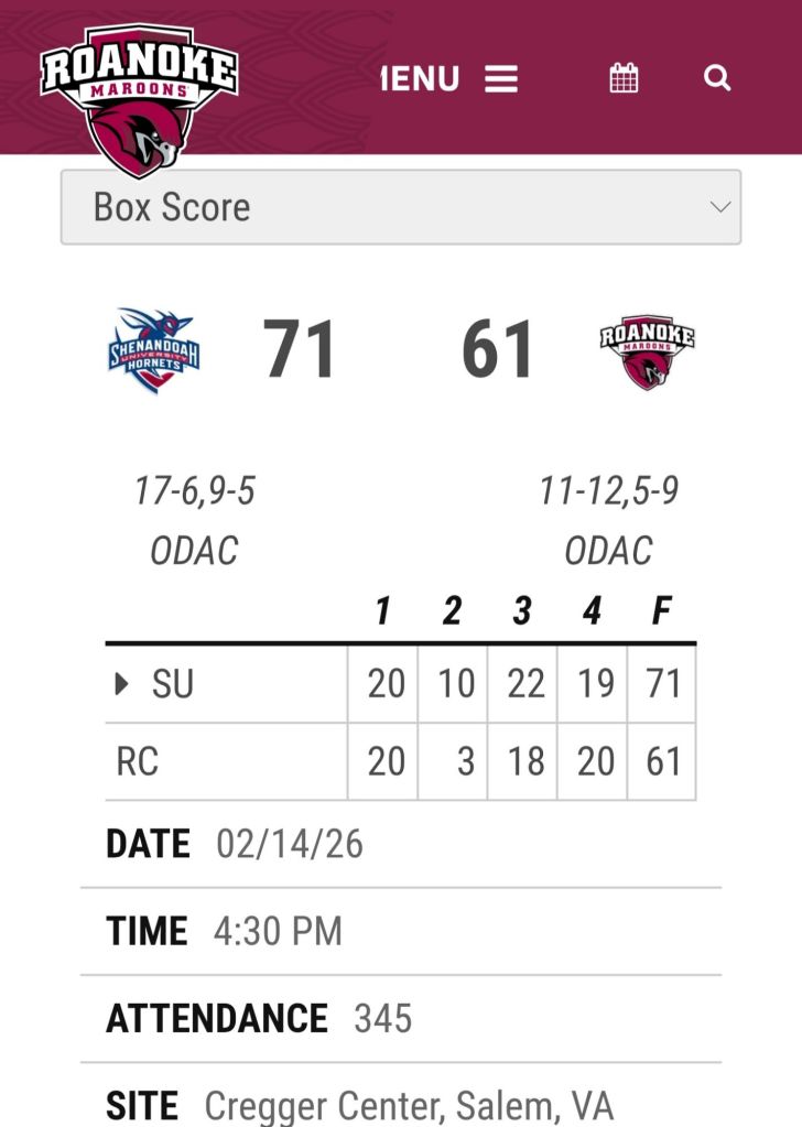 Katie Lam and Roanoke College are underway against Shenandoah University Around the Valley in 60 Days Saved by the Bell π February 14, 2026February 15, 2026 1 Minute Share this: Share on Facebook (Opens in new window) Facebook Share on X (Opens in new window) X Like Loading... Related Published by Around the Valley in 60 Days Trying to find Positive in a World π that needs more of it! View all posts by Around the Valley in 60 Days Published February 14, 2026February 15, 2026