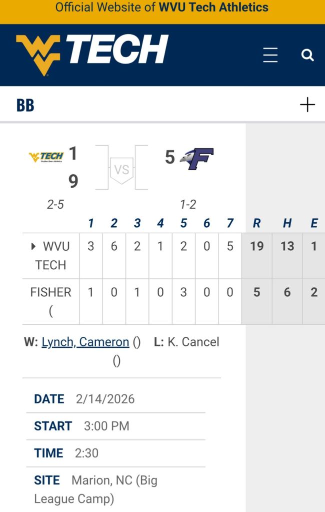 Our Golden Bears π» Baseball βΎοΈ team bounces back in the afternoon to earn a split! Will play 2 again tomorrow, making Ernie Banks smile π Around the Valley in 60 Days West Virginia Tech University February 14, 2026February 15, 2026 1 Minute Share this: Share on Facebook (Opens in new window) Facebook Share on X (Opens in new window) X Like Loading... Related Published by Around the Valley in 60 Days Trying to find Positive in a World π that needs more of it! View all posts by Around the Valley in 60 Days Published February 14, 2026February 15, 2026