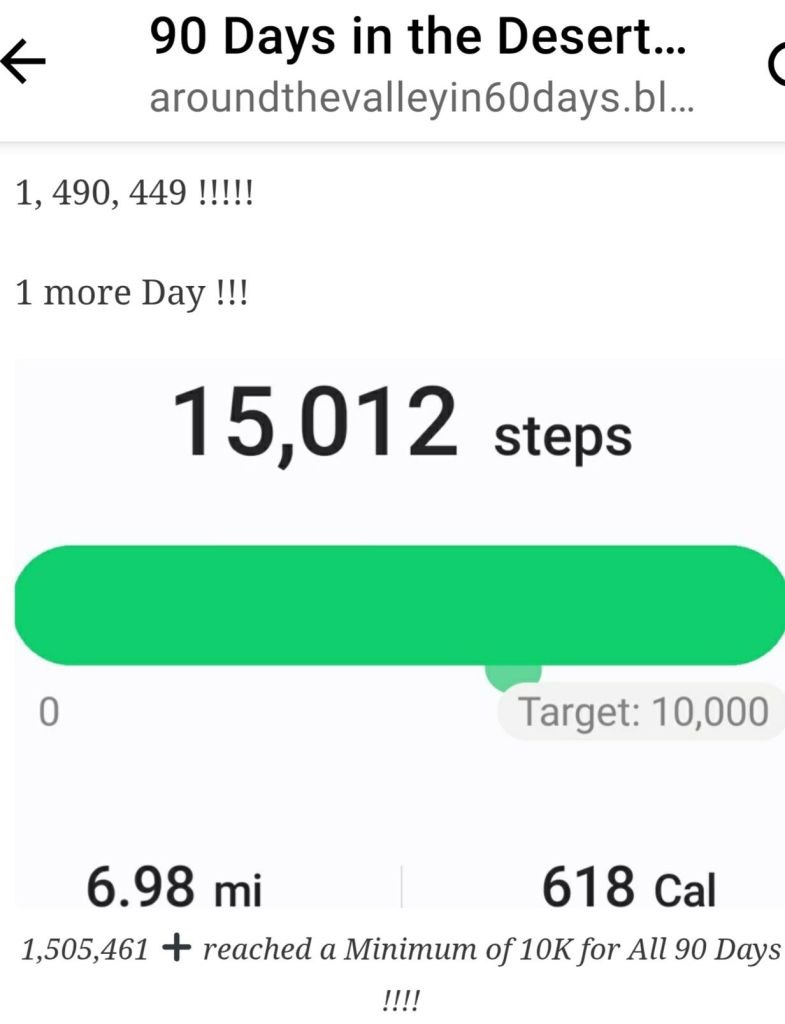 The 90 Days are in the Books π and the total steps πΆββοΈ reached 1.5 Million !!!! Around the Valley in 60 Days OneofUs.Care March 1, 2026 1 Minute March 8th is the date π for the lab work that will see if it worked ! Share this: Share on Facebook (Opens in new window) Facebook Share on X (Opens in new window) X Like Loading... Related Published by Around the Valley in 60 Days Trying to find Positive in a World π that needs more of it! View all posts by Around the Valley in 60 Days Published March 1, 2026