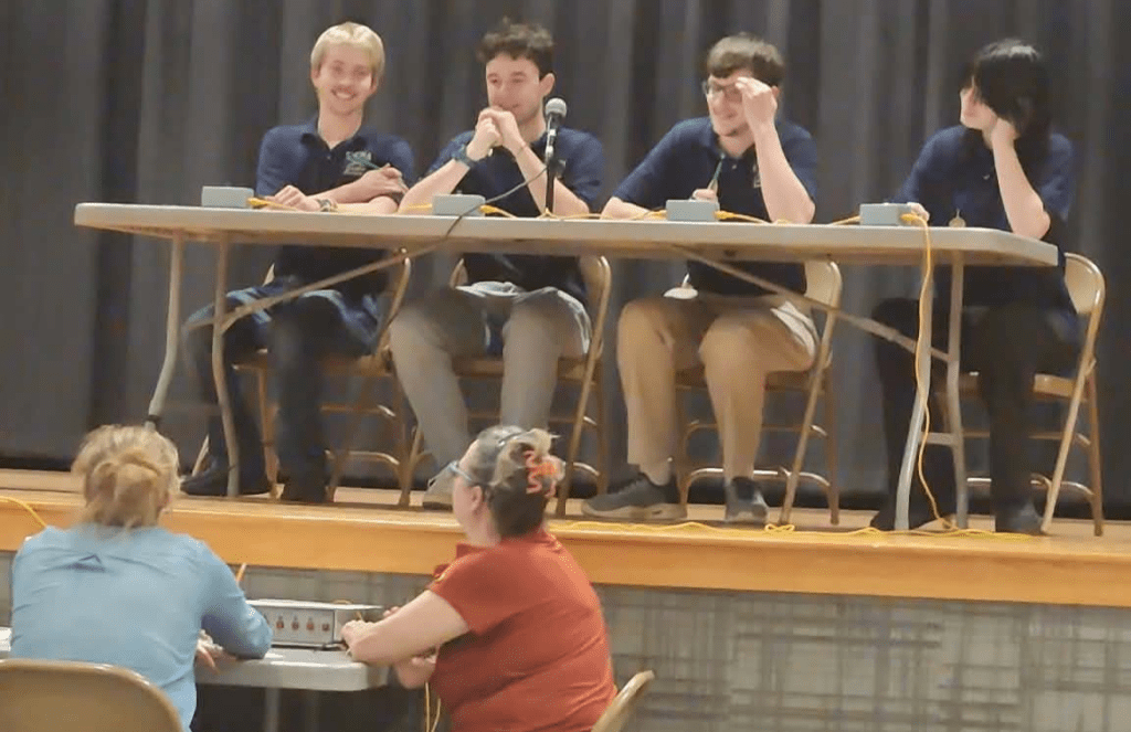 This was probably the closest I have ever come to having a heartattack! The score was 56-60 Grayson & Trenton buzzed in early with the answer. The judges took forever to give us the points making it 61-60. Then Bradley Dalton rang in early with the last question & the boys won 66-60!!!!