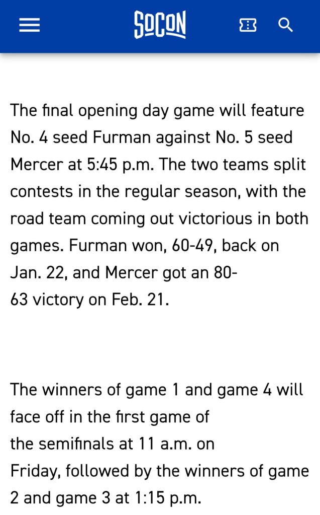 Playing in game four of four today versus Mercer University, the path is straight forward. Defeat the Bears π» and go back to the team hotel π¨ for some rest and return to action π¬ at 11am on Friday morning to face the winner of the #1 – #8 tilt.