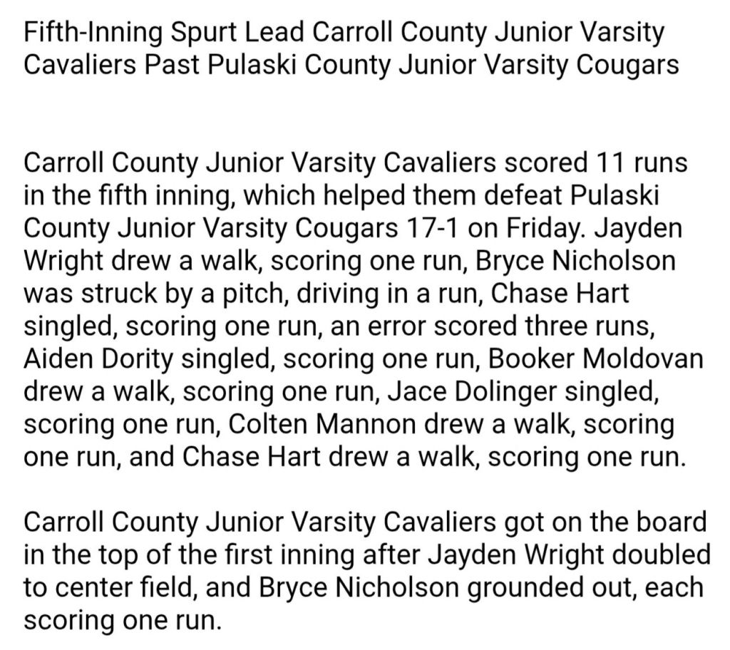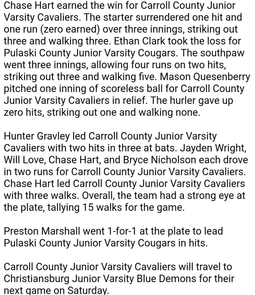 JV Baseball βΎοΈ picks up right where they left off – open season with a 17 -1 victory ! Congrats π to the Nester Nine !!! Around the Valley in 60 Days Carroll County High School March 20, 2026 1 Minute Share this: Share on Facebook (Opens in new window) Facebook Share on X (Opens in new window) X Like Loading... Related Published by Around the Valley in 60 Days Trying to find Positive in a World π that needs more of it! View all posts by Around the Valley in 60 Days Published March 20, 2026
