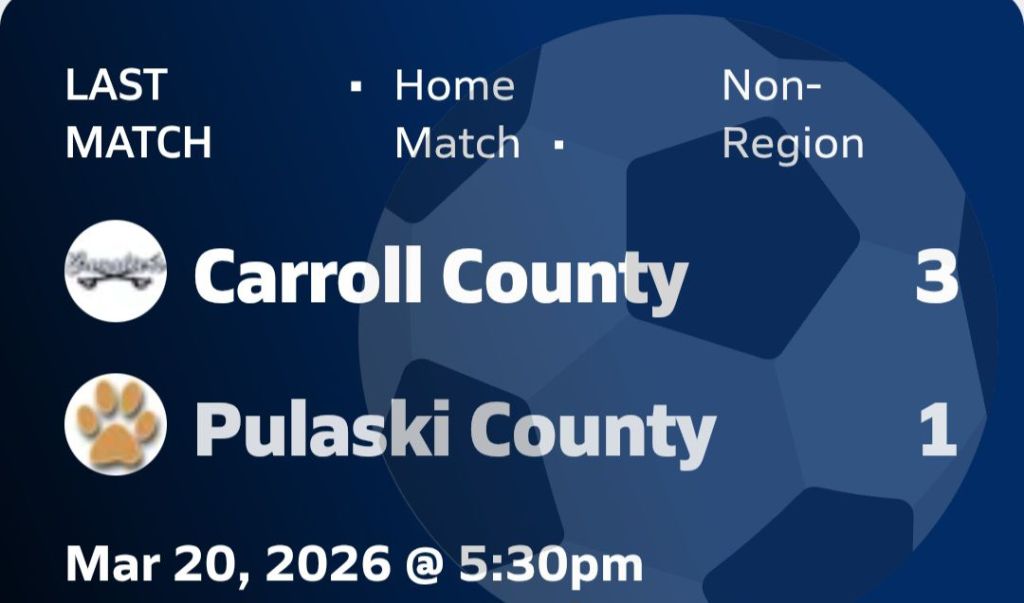 Boys π¦ Soccer β½οΈ splits with Pulaski County on opening night π as Junior Varsity prevails 3-1, and Varsity drops a 2-0 match Around the Valley in 60 Days Carroll County High School March 21, 2026 1 Minute Share this: Share on Facebook (Opens in new window) Facebook Share on X (Opens in new window) X Like Loading... Related Published by Around the Valley in 60 Days Trying to find Positive in a World π that needs more of it! View all posts by Around the Valley in 60 Days Published March 21, 2026