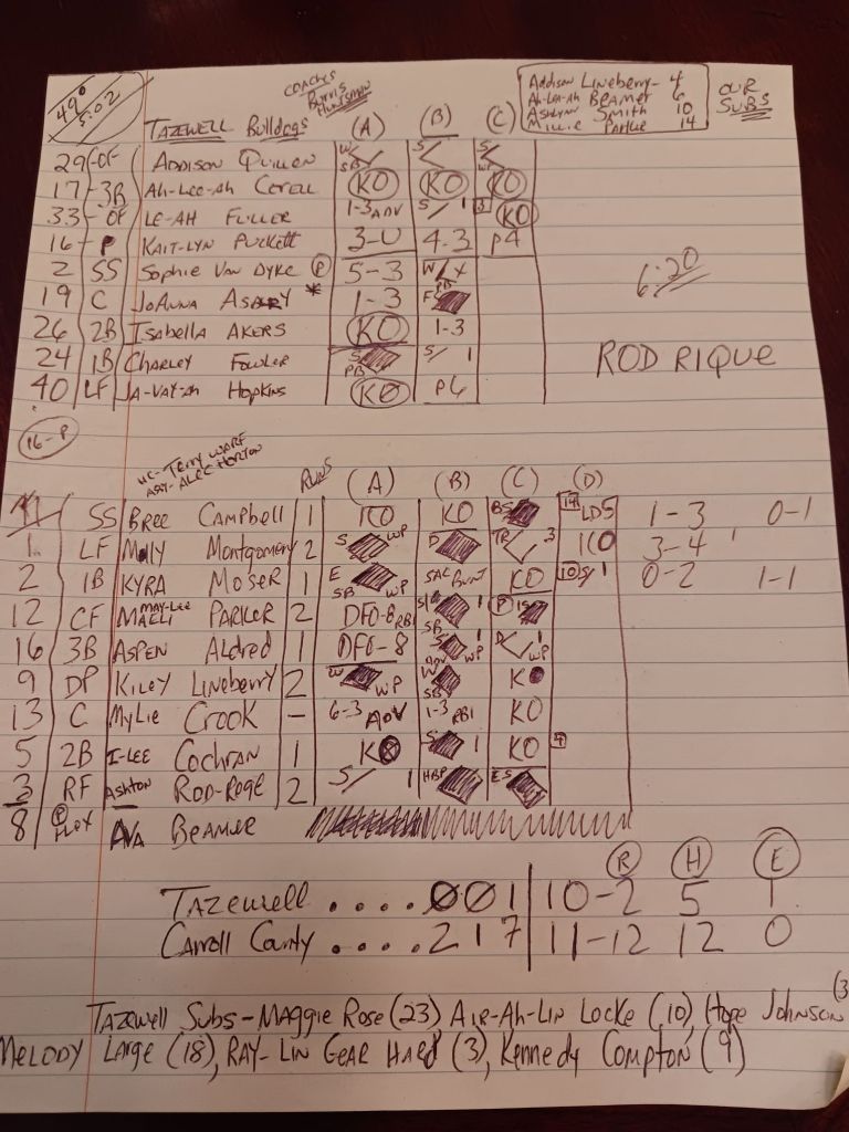 Carroll County JV rode the bat of Molly Molly Montgomery and the right arm of Ava Beamer to a run rule shortened 12 – 2 victory over visiting Tazewell High School.