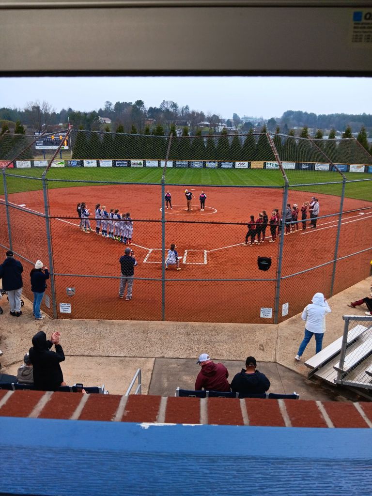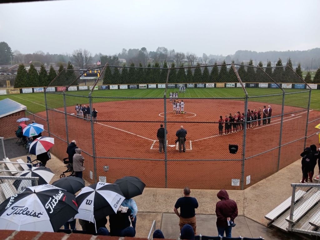 The forecast forced the schools to make two adjustments on the day. First, the flip-flop of Varsity first and then starting the game a few minutes early. First Pitch took place at 4:55 with a slight drizzle falling from the sky.