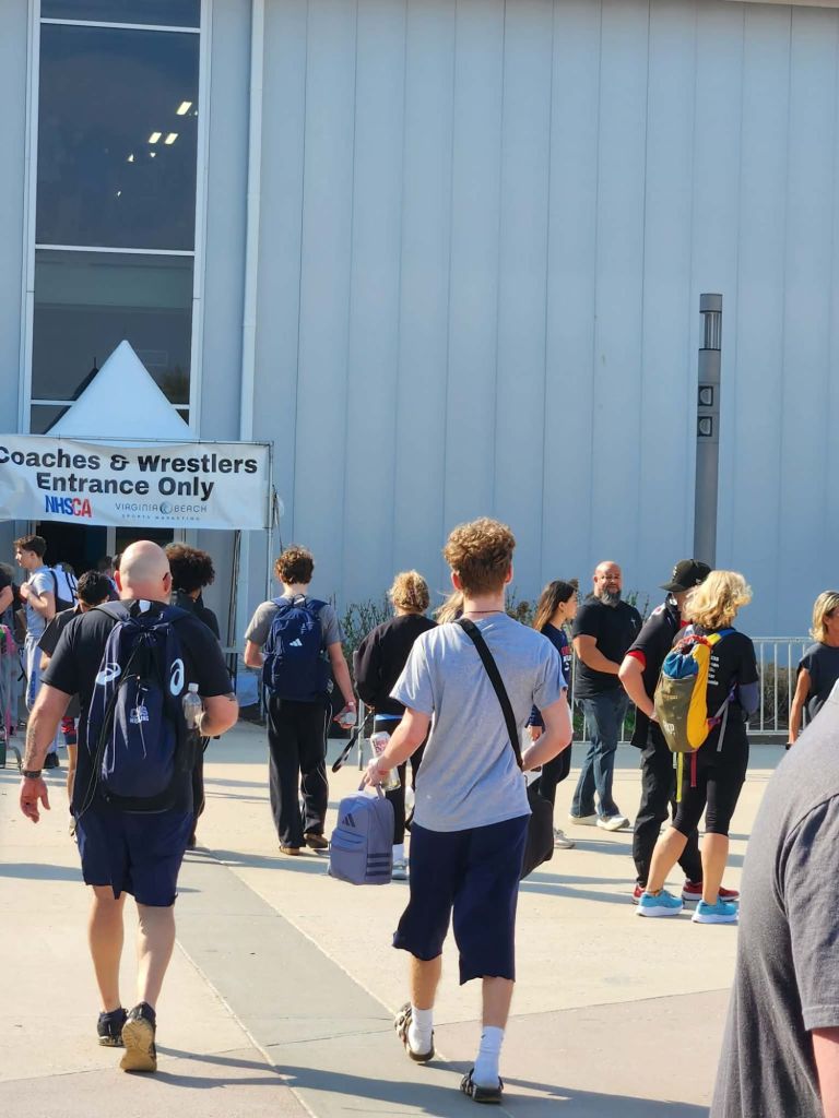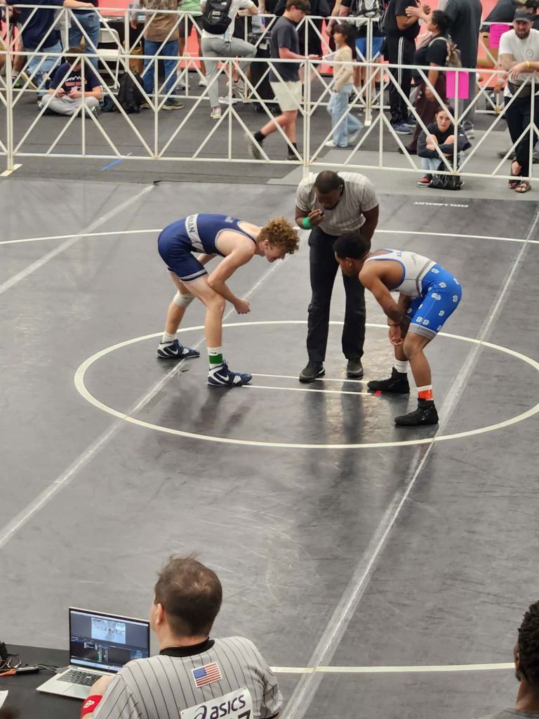 To quote another teams coach, “It sounded like a basketball being slammed down on concrete.” The ref paused the match for an injury time out & after he was able to breathe again, he got up & went back to wrestling. Im not sure he knows the word quit. Trenton ended up losing round 2 but will be back at it tomorrow in the consolation bracket.”