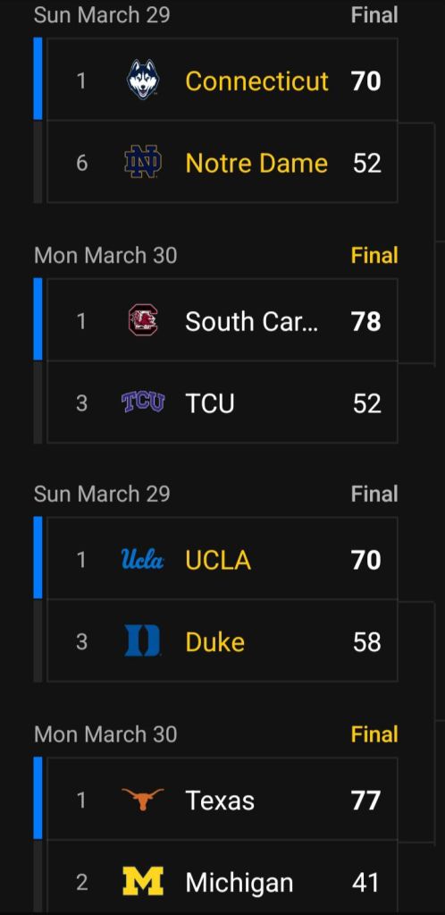 That leaves the two ACC schools, both of which managed to stay within 20 points against two #1 seeds. Duke actually led UCLA by 10 points in the first half before their short rotation wore out against a powerful Bruins team. Hannah Hidalgo once again put on a show, enough that Coach Geno took the time to praise the Notre Dame guard in his post game presser.
