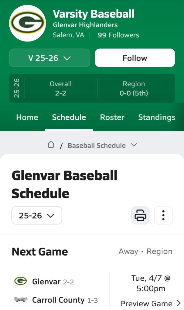 Back to the game preview that I mentioned earlier , Glenvar is coming to The Hill later today for a 5pm Varsity only First Pitch.