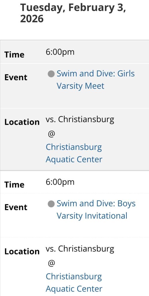 Swim meet at Christiansburg is rescheduled for Thursday.