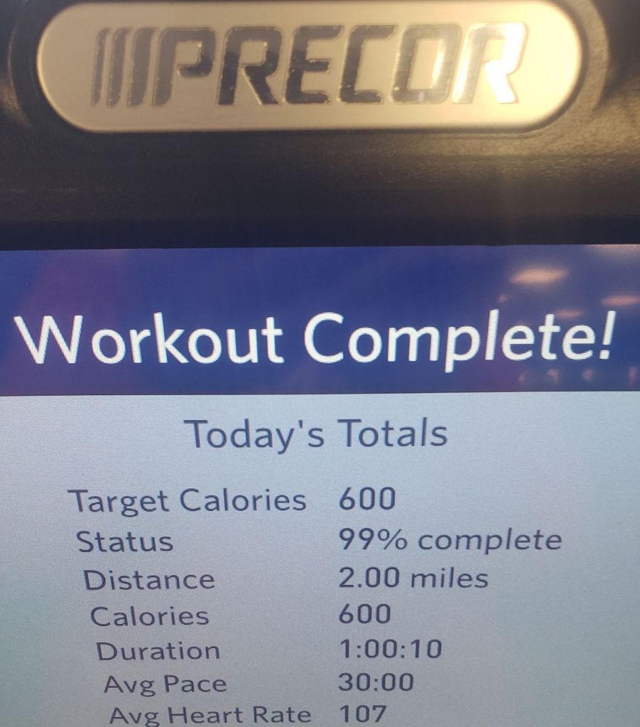 Setting the targets at 600 calories and 2.0 miles stimulated my interest and had me adjusting both the speed and the elevation from start to finish! Anything to make it more interesting….