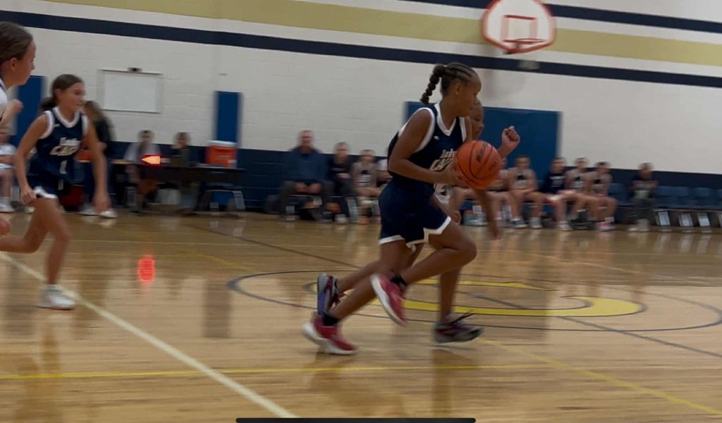End of the 3rd quarter has the score 50-9, both teams rotating in new players after a fast paced first half. Gibson adding to the score and Remington Millaway getting in on the action too. – From Beth