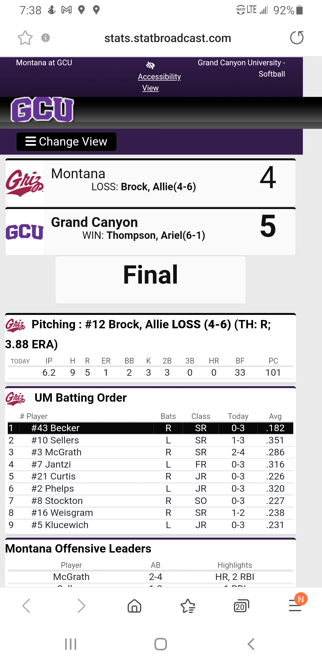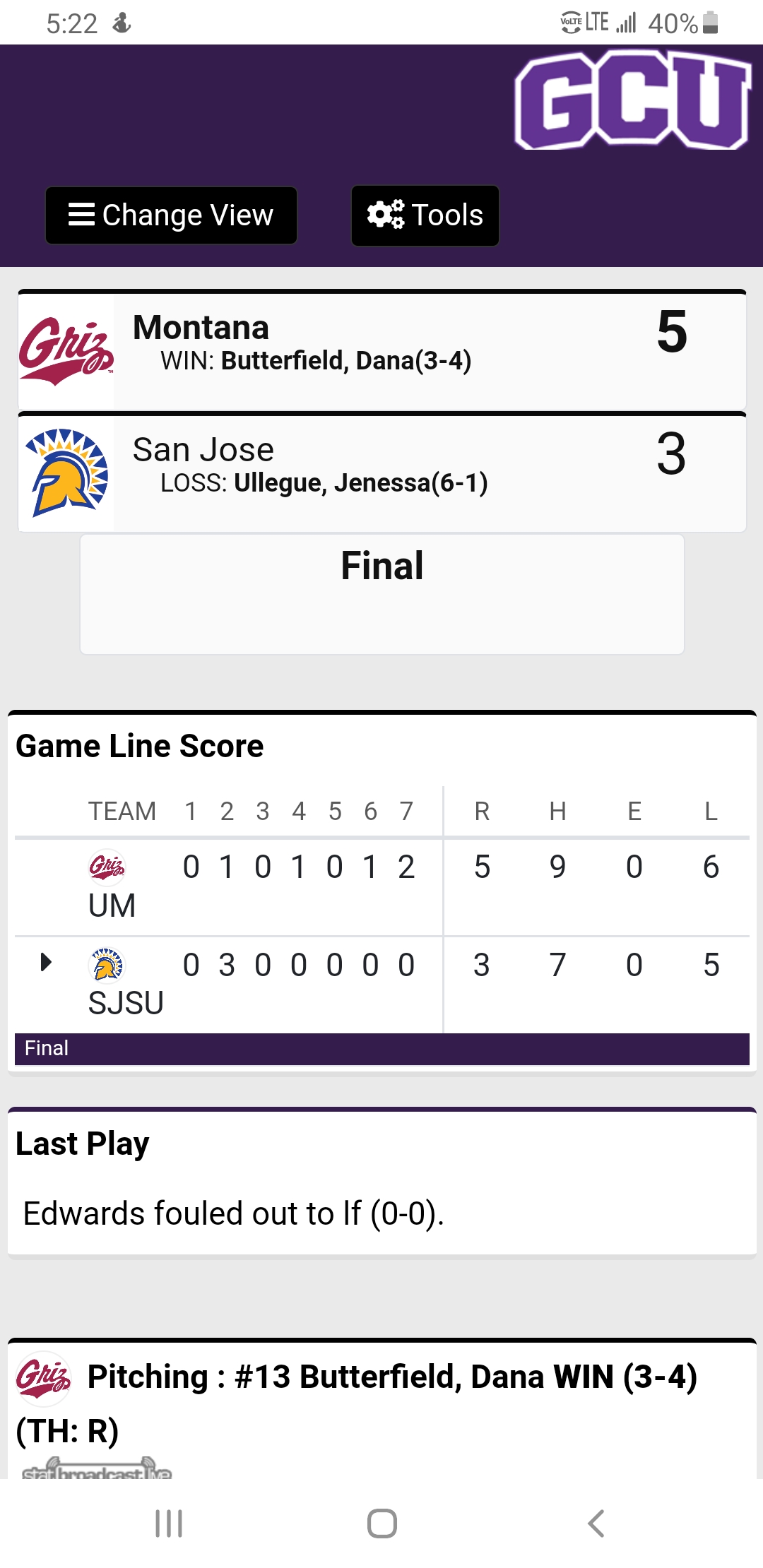 GCU plated three runs in both the first and fifth innings and then held on for a 6-4 victory. Montana will try its luck at 5:32pm MST against the Home team.