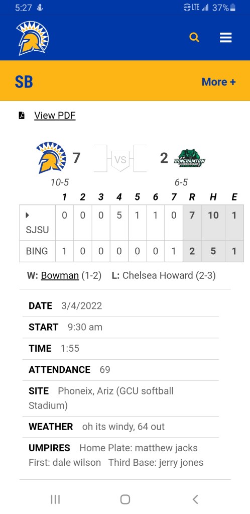 Game #2 of the series took place at Noon with Montana rallying late to defeat San Jose State 5-3. The Grizzs tied in the top of the sixth and then plated the game winners in the top of the seventh.