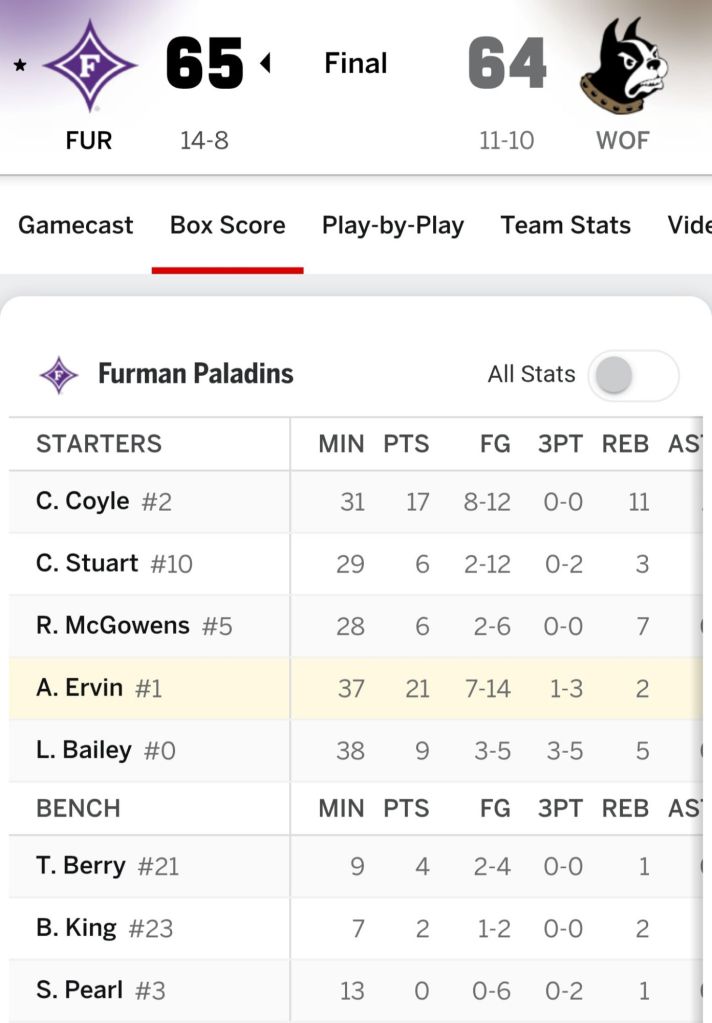 Wofford led most of the game but everytime the lead reached seven or nine, Ervin found an answer. When it happened again in the fourth quarter it was Coyle who said, ” Not on my watch”.