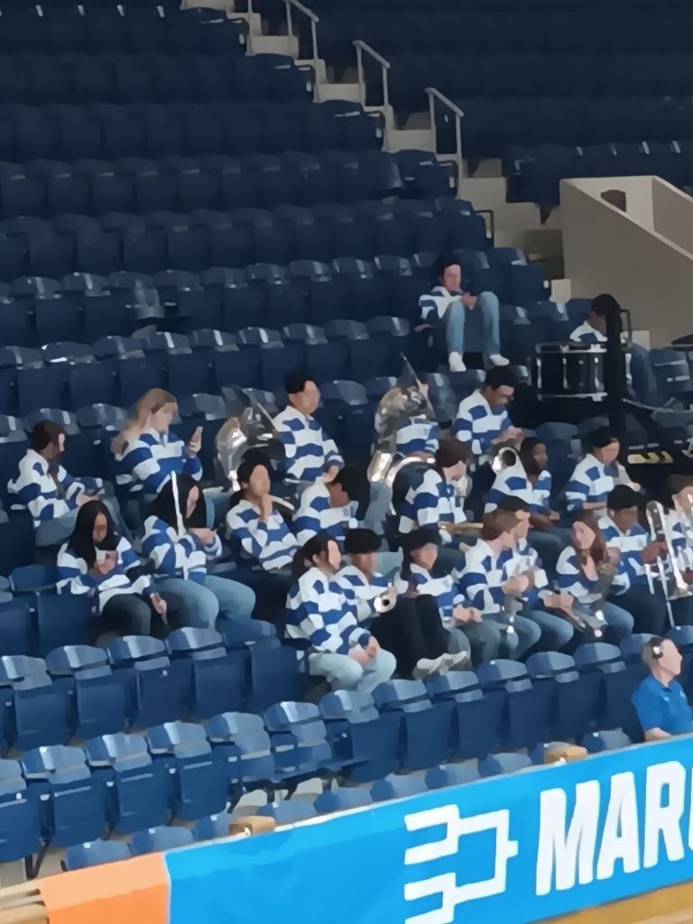 Solid crowd in the Gym with the breakdown being roughly 80/20 in favor of the home team. Both teams have their Pep Bands in the house.